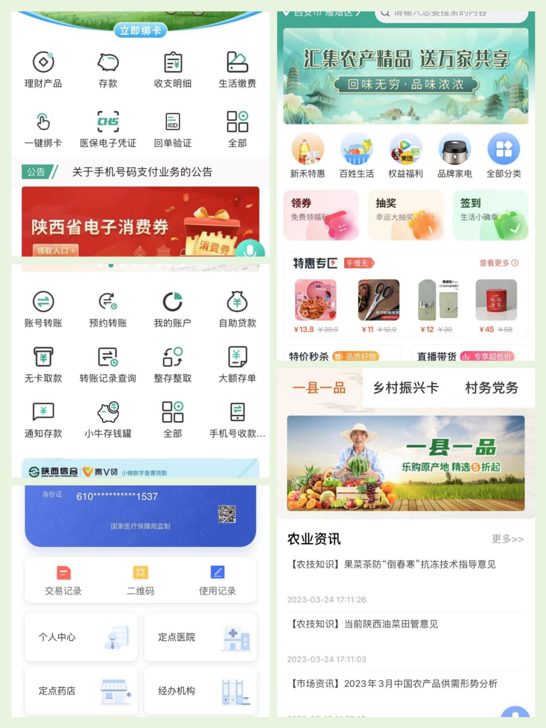 “智慧乡村”金融服务模式实现了农村地区党务、村务、农业、医疗等农村特色服务的数字化整合,有效提升了农村地区客户的金融服务满意度。截至2023年2月,乡村振兴版手机银行已提供了超840万用户流量,涉农资讯等业务总量超18万笔,咸阳、宝鸡、铜川、渭南、延安、汉中、榆林、安康、商洛等县域特产馆特色农产品累计销售额超263万,有效激发了乡村消费市场活力。“金融e站”小程序4月将在耀州、咸阳、韩城、富县、榆林等9地推广,将进一步提升农村金融服务可得性。